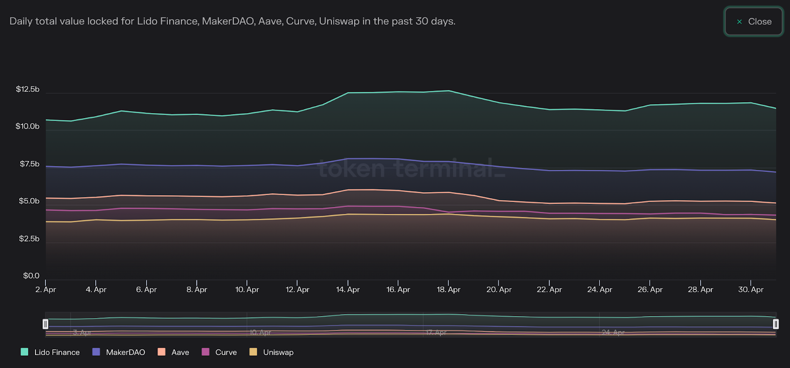Lido Finance is continuing to hold the top spot after snatching it in January from the long-term king of TVL, MakerDAO. Its TVL stands at an impressive ~$12B up 2B from March. MakerDAO is holding the second place with a stable ~$7.3B TVL, followed by AAVE and Curve with ~$5.2B and ~$4.4B TVL for the 3rd and 4th place. Finally Uniswap regained its #5 spot from Convex with ~$4B in TVL.