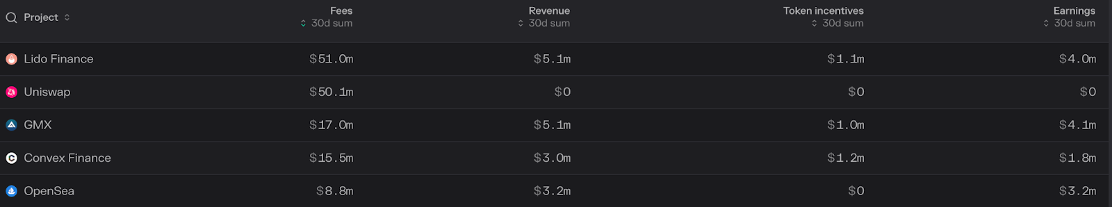 And finally let’s look at the top 5 DeFi/NFT protocols/ecosystems with the most fees generated over 30 days, which generally translates to the most active protocols. In some cases, the protocols take a % of the fee as revenues (eg. Lido Finance) in other cases its distributed almost entirely to the Liquidity Providers Stakeholders (eg. Uniswap Liquidity Providers) hence their revenue varies based on such parameters.