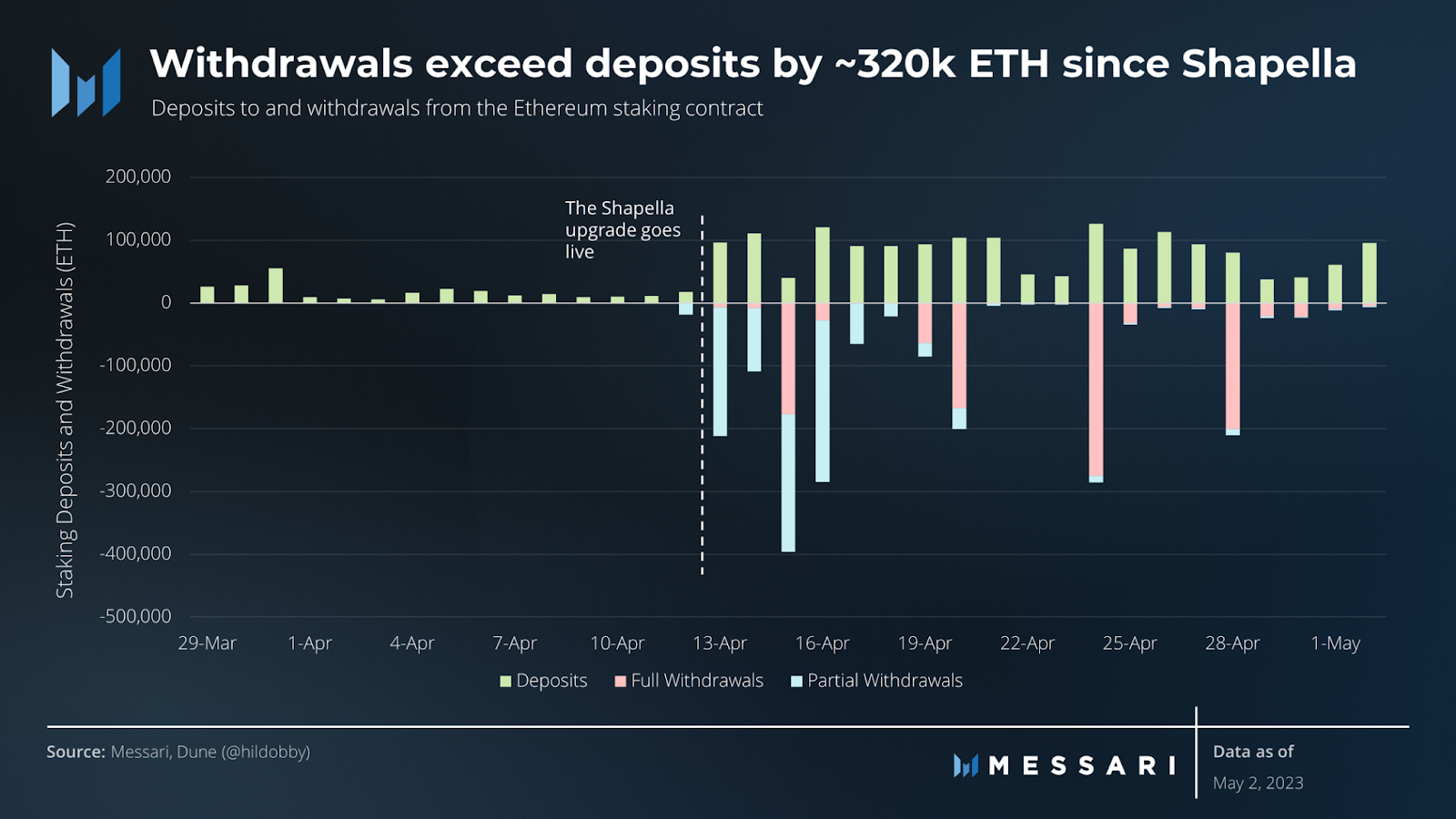 The Ethereum network has completed its transition to a full-featured Proof-of-Stake (PoS) network with the activation of the Shanghai/Capella (Shapella) upgrade. The most significant update enabled the withdrawal of ETH from the staking contract, which has resulted in a net outflow of 320,000 ETH from the contract, with a gross total of around 2 million ETH withdrawn since the upgrade.