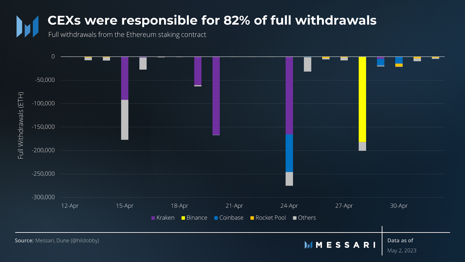 Centralized exchanges have played a significant role in the withdrawals of Ethereum, with 82% of the total ETH withdrawn being from these exchanges. Kraken is the largest contributor, accounting for 48% of the ETH withdrawn. It had to stop its staking program in the US due to a settlement with the Securities and Exchange Commission. Binance and Coinbase follow Kraken, accounting for 18% and 11% of the full withdrawals, respectively.