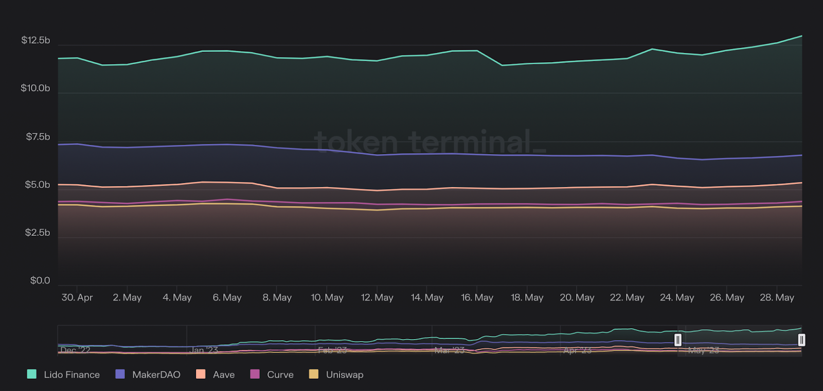 Lido Finance is continuing to hold the top spot after snatching it in January from the long-term king of TVL, MakerDAO. Its TVL stands at an impressive ~$13B up $3B from March and up $1B from April. MakerDAO holds the second place with a stable ~$7B TVL, followed by AAVE and Curve with ~$5.3B and ~$4.4B TVL for the 3rd and 4th place. Finally Uniswap maintained its #5 for 2nd month in a row with ~$4B in TVL. Overall, the top 5 ranking hasn’t changed since April.