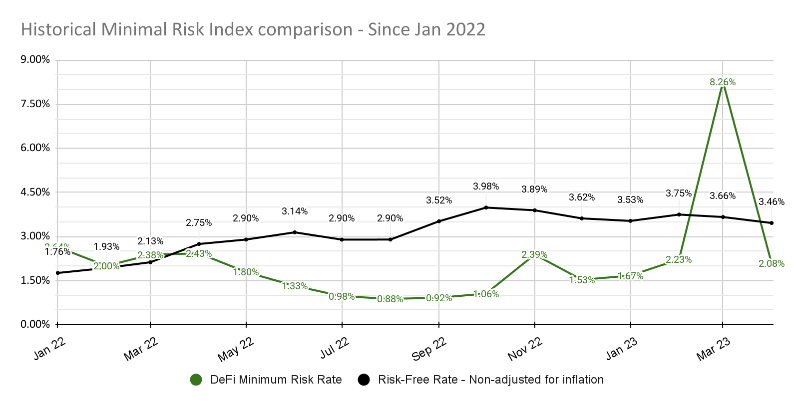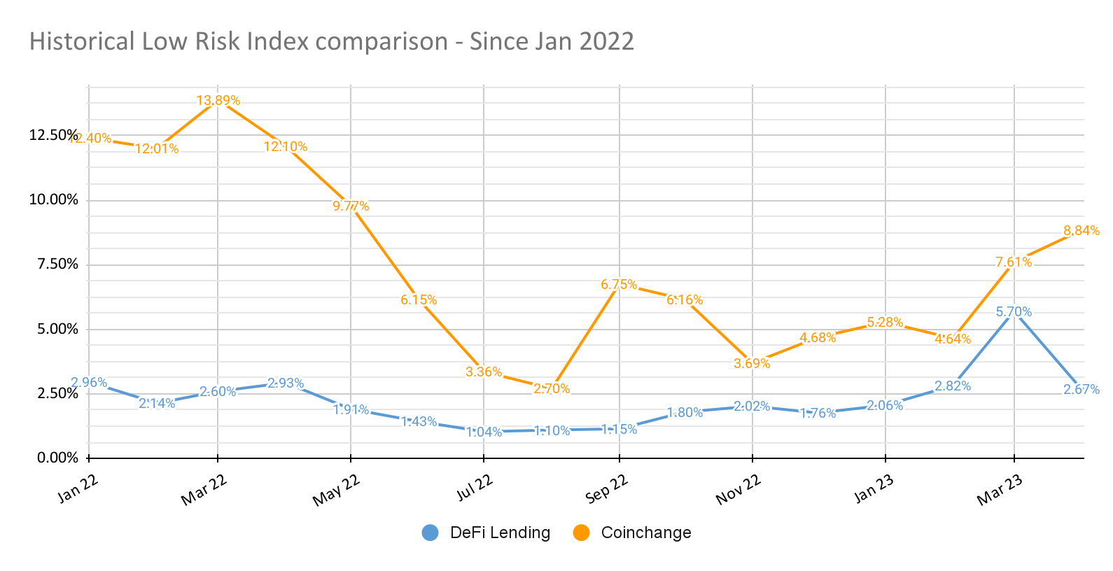 For the month of April, Coinchange has gained back its status as highest APY amongst all indexes at an impressive 8.84%, which it had lost in November after staying in this position 2 months. CeFi Yield index is back close to its December 2022 rate at 7.32%, and thus is recording 6 consecutive months above 6% APR. The DeFi Minimum Risk Rate has decreased by a whopping -6.18% to stand at 2.08%, in line with the normal level since November 2022.